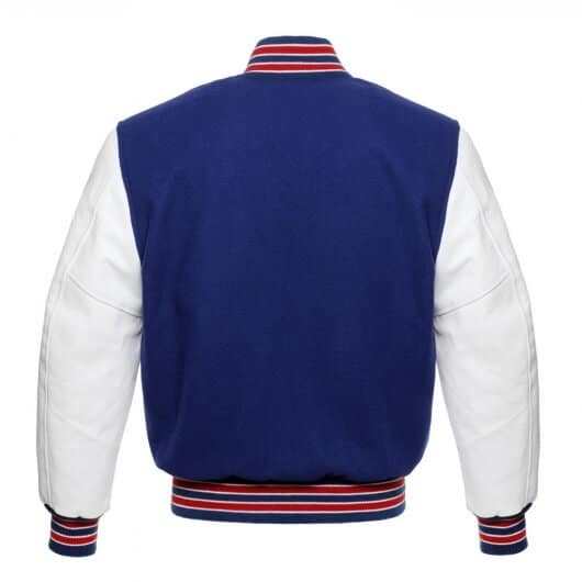 Royal Blue and Red Striped Letterman Jacket with White Leather Sleeves